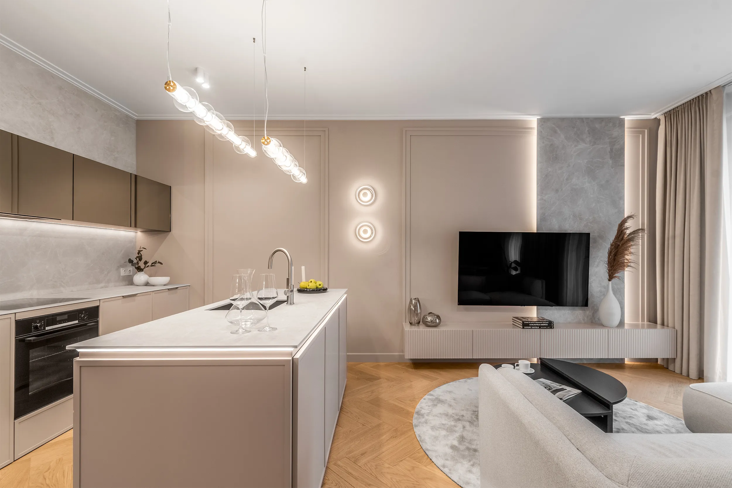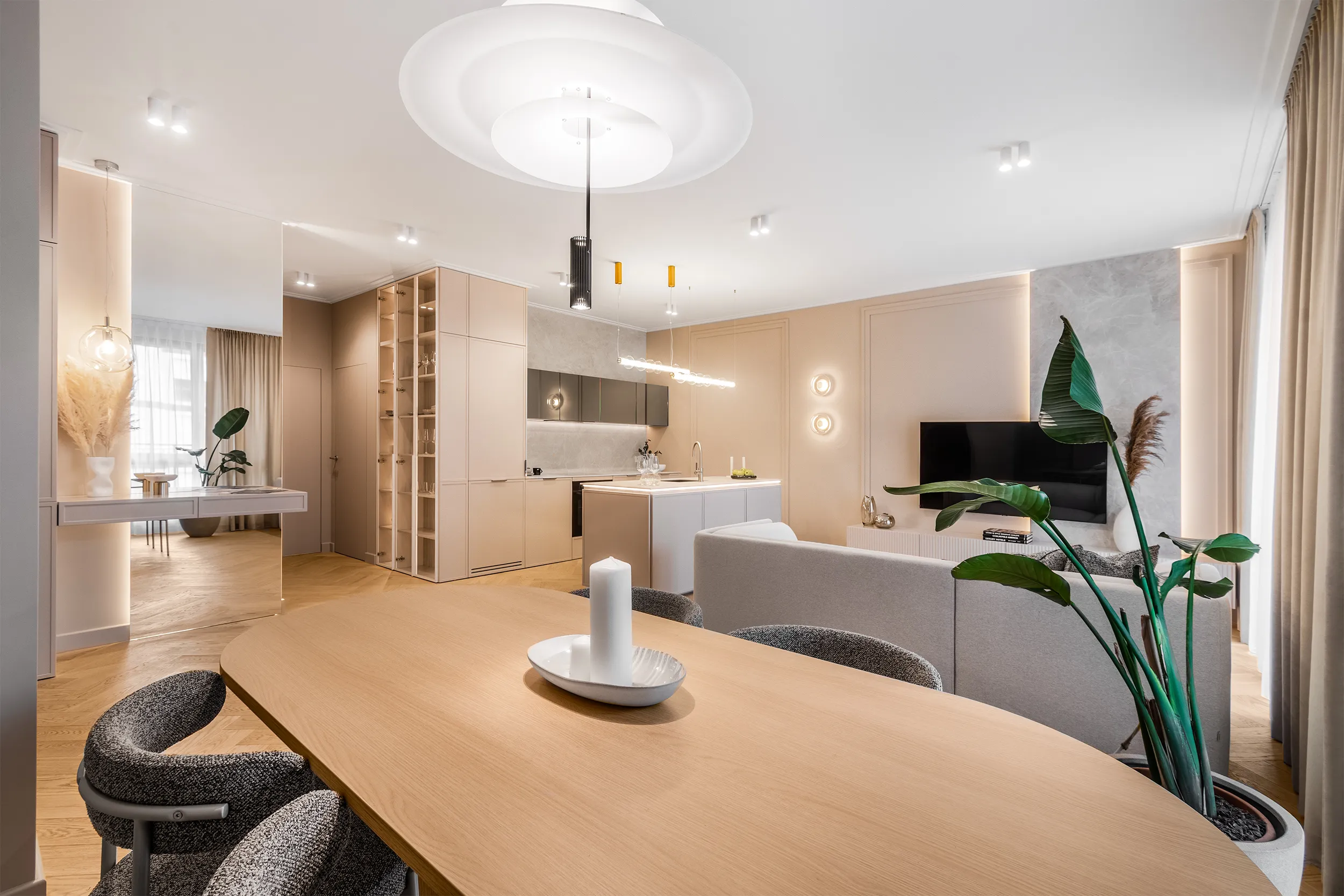 Apartament przy ul. Branickiego to przestrzeń stworzona z myślą o osobach ceniących nowoczesny design, funkcjonalność i komfort codziennego życia. Otwarty układ wnętrza, przemyślana aranżacja oraz eleganckie detale tworzą harmonijną całość, idealną zarówno do wypoczynku, jak i spotkań w gronie bliskich. Kuchnia z wyspą, przytulna strefa dzienna i przestronna sypialnia z garderobą spełniają oczekiwania nawet najbardziej wymagających użytkowników. Dodatkowy pokój daje możliwość elastycznego dopasowania przestrzeni – jako pokój dziecka lub domowe biuro. Całość dopełniają wysokiej jakości materiały, nastrojowe oświetlenie i subtelne elementy dekoracyjne, które nadają wnętrzu wyjątkowy charakter.