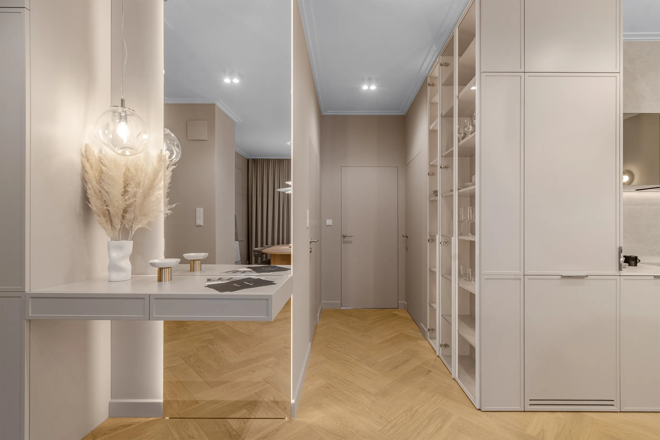 Już od progu wita nas elegancka zabudowa meblowa z konsolą i lustrem – to idealne miejsce na odłożenie drobiazgów zaraz po wejściu do mieszkania. Całość dopełnia subtelnie podświetlone lustro, które dodaje lekkości i nowoczesnego charakteru tej strefie.