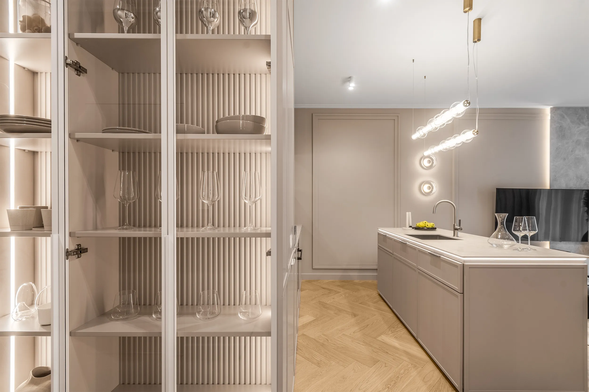 Zastosowane oświetlenie warstwowe (oprawy wpuszczane, podświetlenia liniowe, lampy wiszące i dekoracyjne) umożliwiają tworzenie zróżnicowanych scenariuszy świetlnych – w zależności od pory dnia i nastroju.