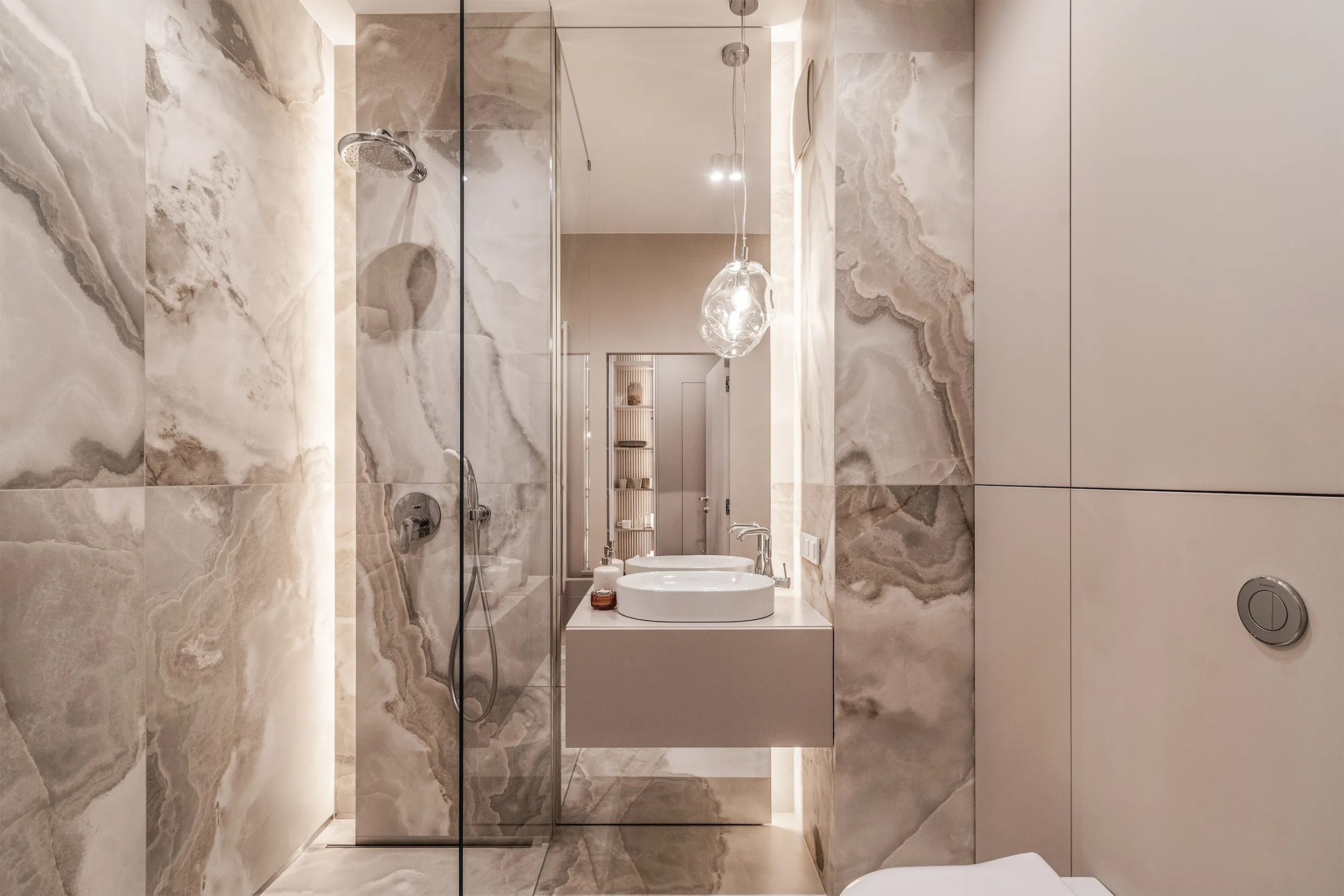 Łazienki wykończone zostały wielkoformatowymi płytami marki Florim – jednego z czołowych włoskich producentów ceramiki. Struktura płytek inspirowana alabastrem, nadaje wnętrzom wyjątkowego i szlachetnego charakteru.