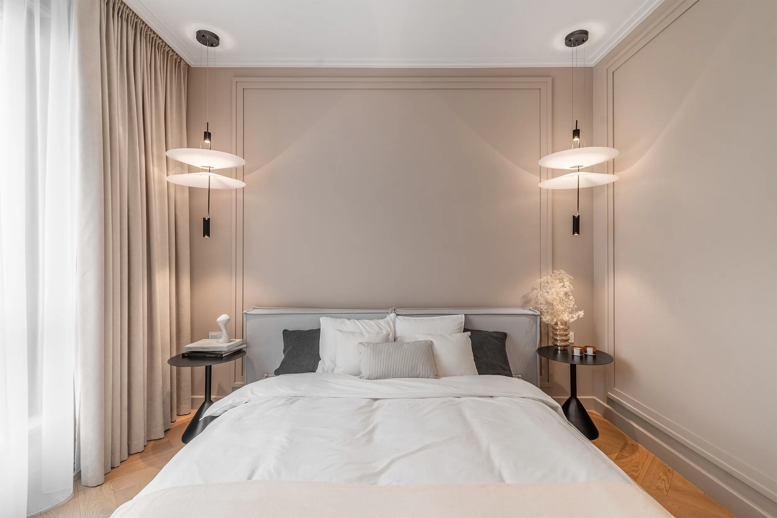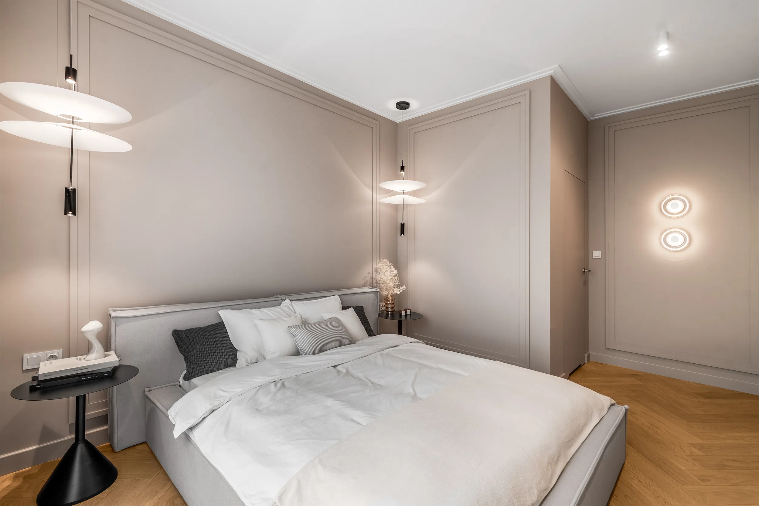 W ramach aranżacji układu mieszkania zmodernizowano również sypialnię główną, dodając do niej osobną garderobę. Wnętrze sypialni jest subtelne, delikatne i niezwykle przytulne. Nad stolikami nocnymi zawisły dekoracyjne lampy, które nadają wnętrzu wyjątkowego charakteru.
