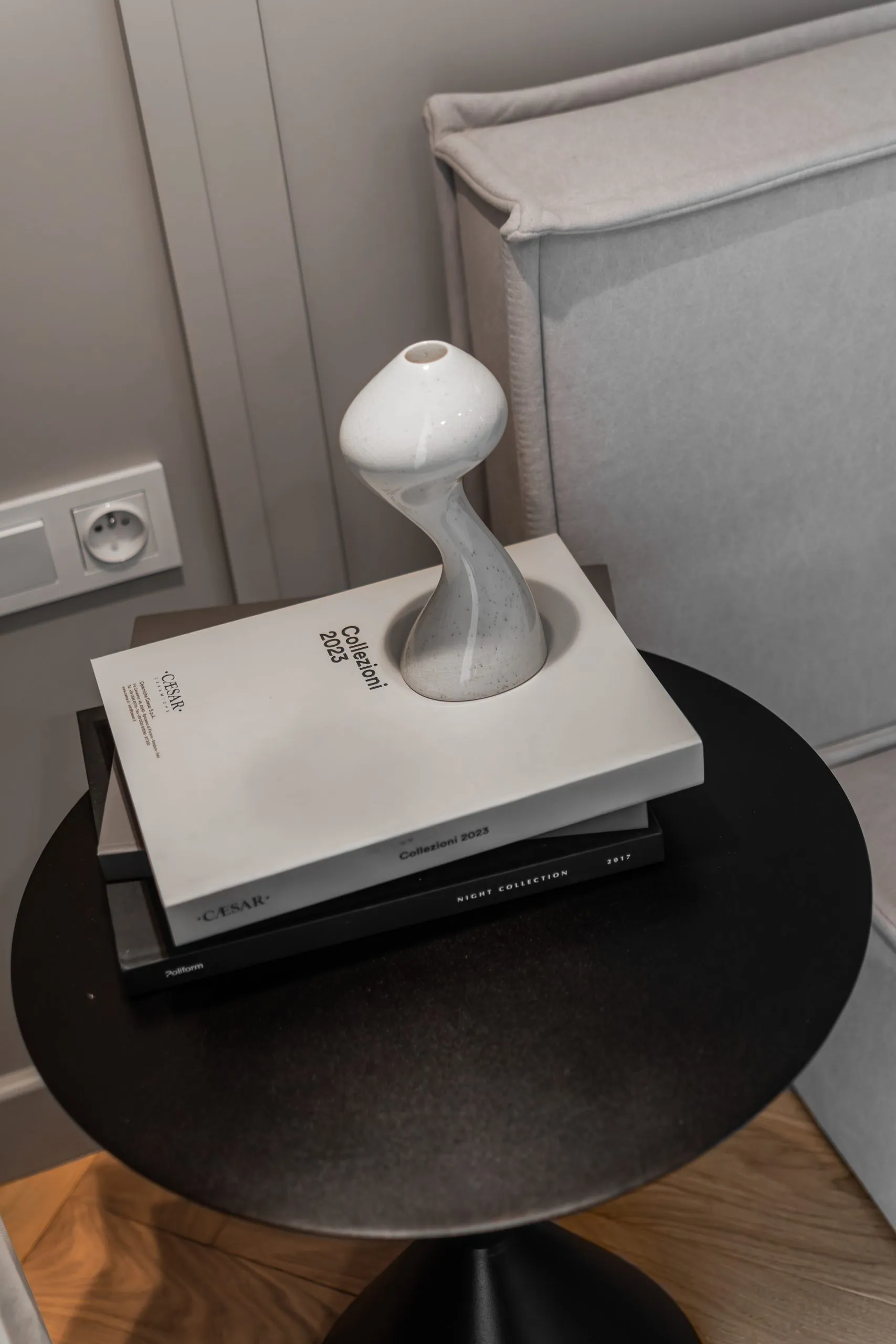 Bliskość Pałacu w Wilanowie zainspirowała Architekta do sięgnięcia po klasyczne środki wyrazu i detalu architektonicznego, ale w ich nowoczesnej, minimalistycznej interpretacji. Tak aby wpisały się w nowoczesny charakter apartamentu we współczesnym budownictwie nie zatracając swojego klasycznego charakteru.